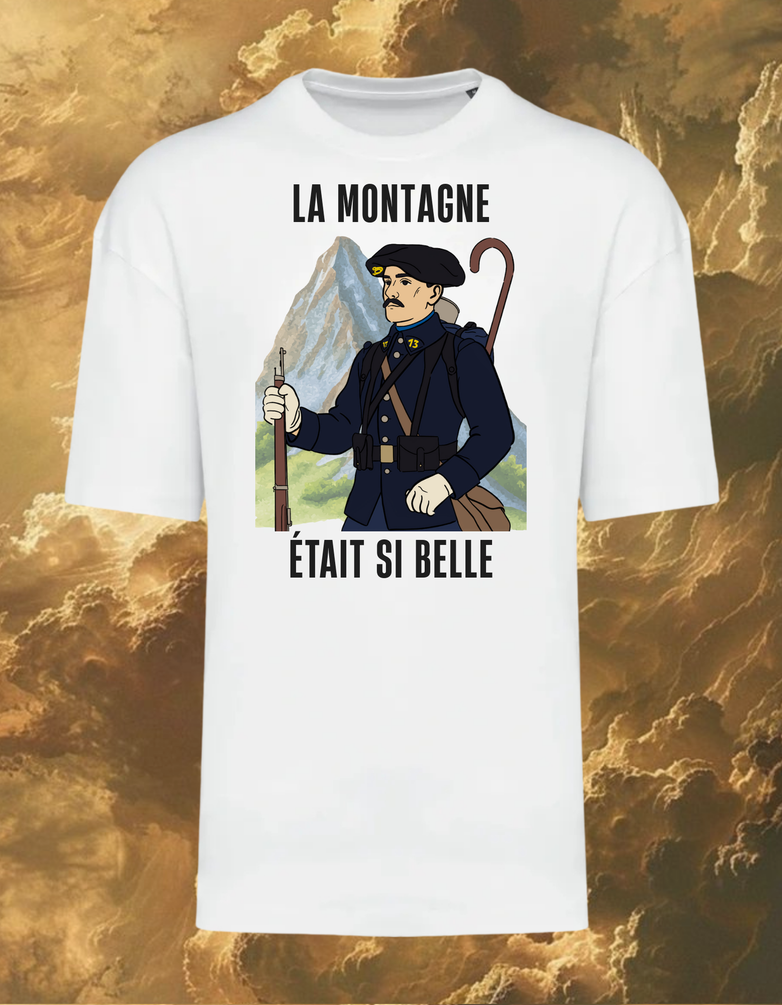 T-shirt LE CHASSEUR ALPIN, retrouvez la force de ces soldats des cimes. Le dessin exclusif MNEMIA montre un chasseur dans la neige, entre froid et courage.