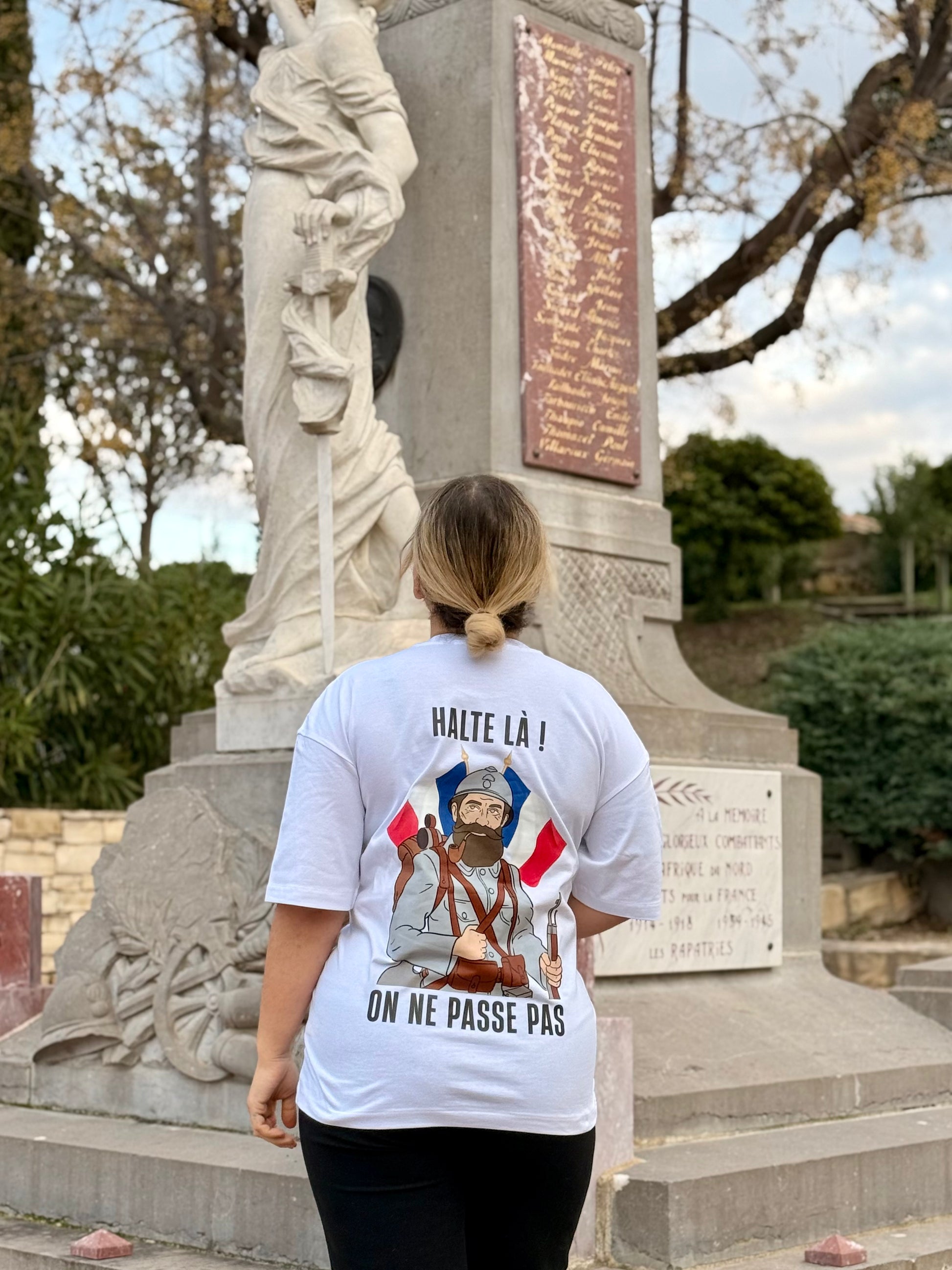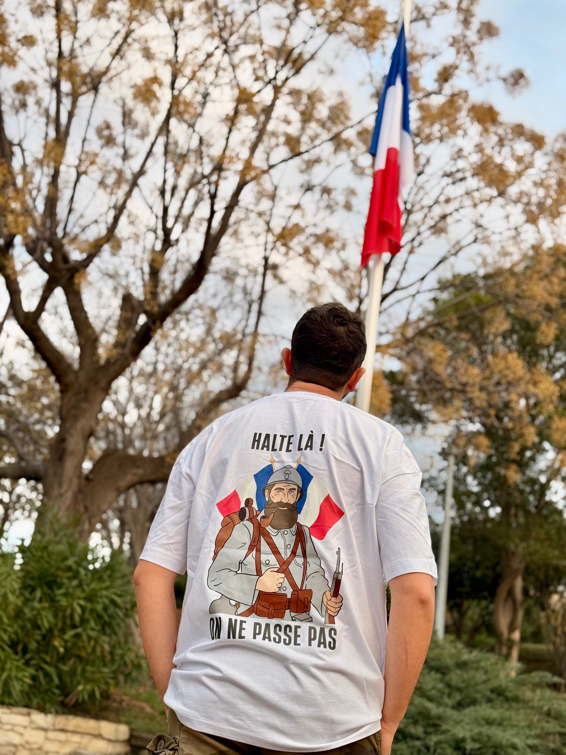 Notre t-shirt LE POILU, qui célèbre le courage et la résilience des soldats de la Grande Guerre. Illustré d’un dessin exclusif MNEMIA, accompagné de la phrase historique : “Halte là ! On ne passe pas”.